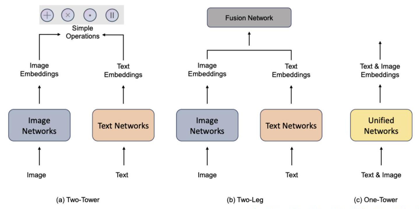 그림 1: 멀티모달 모델 아키텍처 개요: (a) Two-Tower [13], [14], [15], [16], [17], [18], [19], [20], [21], [22], [23], [24]: 이미지와 텍스트를 별도로 처리하고 간단한 연산(더하기, 곱하기, 내적 및 연결)을 통해 임베딩을 결합합니다. (b) Two-Leg [25], [26], [27], [28], [29], [30], [31], [32], [33], [34], [35], [36], [37], [38], [39]: 별도의 이미지 및 텍스트 임베딩을 Fusion Network를 사용하여 결합합니다. (c) One-Tower [12], [40], [41], [42], [43], [44], [45], [46], [47], [48]: 통합된 네트워크를 활용하여 이미지 및 텍스트 입력을 공동으로 임베딩합니다. 텍스트 데이터를 공통 표현 공간으로 변환하여 보다 자연스럽게 결합하기 쉽게 만듭니다. 이러한 설계는 일반적으로 양식 간의 관계가 잘 이해되고 효과적으로 모델링될 때 모델의 단순성과 효율성을 우선시합니다.