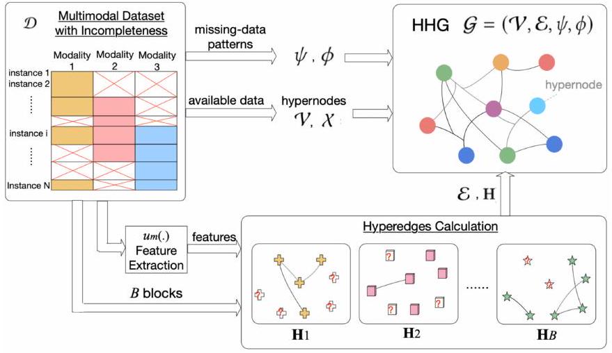 그래픽 모델은 멀티모달 데이터를 표현하고 융합하는 강력한 접근 방식을 제공하여 서로 다른 양식 간의 복잡한 관계를 효과적으로 포착합니다 [170]. 이러한 모델은 불완전한 멀티모달 데이터를 처리하는 데 특히 유용합니다. 예를 들어, 이종 그래프 기반 멀티모달 융합(HGMF) 방법 [171]은 불완전한 멀티모달 데이터를 모델링하고 융합하기 위해 이종 하이퍼노드 그래프를 구성합니다. HGMF는 하이퍼노드 그래프를 활용하여 데이터 대체를 요구하지 않고 다양한 데이터 조합을 수용하여 다양한 양식에 걸쳐 강력한 표현을 가능하게 합니다 [171]. 그림 5는 [171]에서 하이퍼노드 구성을 보여줍니다.