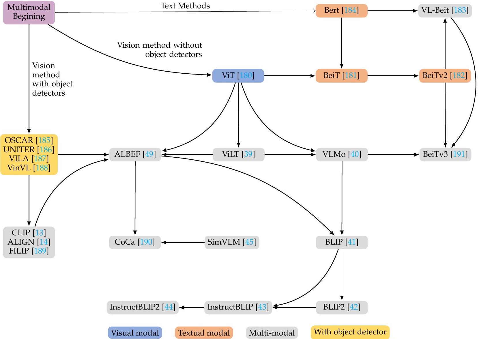 그림 6: 멀티모달 융합의 핵심 문헌 진화 및 계승 관계. 이 다이어그램은 시각, 텍스트, 멀티모달 및 객체 감지 강화 모델로 원래 분류된 다양한 모델 간의 관계 및 개발 경로를 보여줍니다. 화살표는 한 모델에서 다른 모델로의 영향 또는 진행을 나타냅니다. 각 모델의 초점은 범주를 설명하는 하단의 범례와 함께 해당 양식을 나타내도록 색상으로 구분됩니다.
