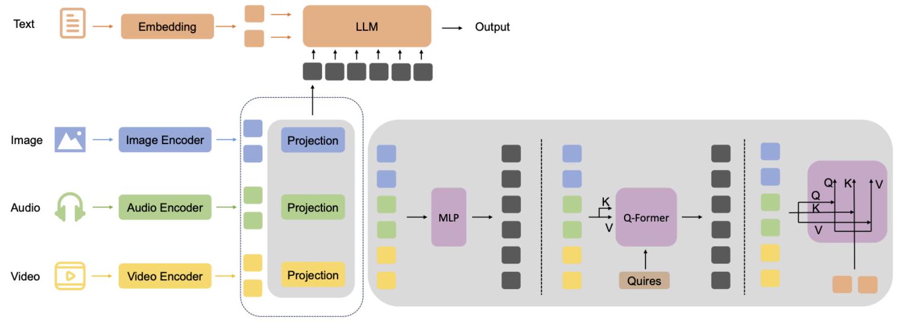 그림 7: 어텐션 기반 커넥터. 이 파이프라인은 대규모 언어 모델(LLM)을 사용한 멀티모달 융합을 보여줍니다. 텍스트 입력은 임베딩되어 LLM에 의해 처리되는 반면, 이미지, 오디오, 비디오 입력은 인코딩되어 공유 임베딩 공간으로 투영되고 MLP 및 Q-Former와 같은 모듈을 통과합니다. Q-Former는 어텐션 메커니즘(쿼리, 키, 값)을 사용하여 LLM을 통해 최종 출력을 생성하기 전에 멀티모달 특징을 정렬합니다. 심층적인 모달 간 상호작용과 융합을 강조한 방법들과 비교했을 때 [1], [49]. ViLT는 데이터셋 편향이나 더 강력한 시각적 기능에 대한 내재된 필요성 때문에 많은 작업에서 이러한 방법들보다 뒤쳐졌습니다 [49]. 일반적으로 시각적 모델은 더 나은 결과를 얻기 위해 텍스트 모델보다 커야 하며, 성능 저하는 주로 경량 시각적 임베딩 전략으로 인해 발생하지 않았습니다.