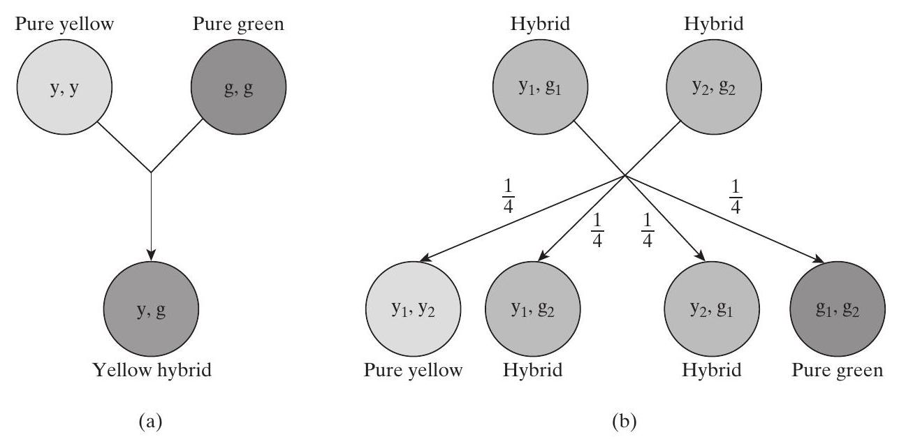 따라서 장기적으로 볼 때, 플레이어는 216번의 게임당 17단위를 잃게 될 것이다. $\square$ 다음 예시에서는 Gregor Mendel (1822-1884)이 개발한 유전 이론의 가장 간단한 형태를 살펴본다. 어떤 사람의 특정 특성(예: 눈 색깔 또는 왼손잡이)이 한 쌍의 유전자에 의해 분류된다고 가정하고, $d$는 **우성 유전자(dominant gene)**를, $r$은 **열성 유전자(recessive gene)**를 나타낸다고 가정하자. 따라서 $dd$ 유전자를 가진 사람은 **순수 우성(purely dominant)**이고, $rr$ 유전자를 가진 사람은 **순수 열성(purely recessive)**이며, $rd$ 유전자를 가진 사람은 **잡종(hybrid)**이다. 순수 우성 개체와 잡종 개체는 겉모습이 같다. 자녀는 각 부모로부터 1개의 유전자를 받는다. 특정 특성에 대해 2명의 잡종 부모가 총 4명의 자녀를 가질 때, 4명의 자녀 중 3명이 우성 유전자의 겉모습을 가질 확률은 얼마인가?  그림 4.5 (a) 순수 노란색 씨앗과 순수 녹색 씨앗의 교배; (b) 잡종 1세대 씨앗의 교배. 앞의 그림 4.5a와 b는 잡종 노란색(우성) 씨앗과 녹색(열성) 씨앗이 교배될 때 어떤 일이 일어날 수 있는지를 보여준다. **풀이** 각 자녀가 각 부모로부터 2개의 유전자 중 하나를 동등하게 물려받을 가능성이 있다고 가정하면, 2명의 잡종 부모의 자녀가 $dd$, $rr$, $rd$ 유전자 쌍을 가질 확률은 각각 $\frac{1}{4}, \frac{1}{4}, \frac{1}{2}$이다. 따라서 자손이 유전자 쌍이 $dd$ 또는 $rd$인 경우 우성 유전자의 겉모습을 가지므로, 그러한 자녀의 수는 모수 $\left(4, \frac{3}{4}\right)$를 갖는 **이항 분포(binomially distributed)**를 따른다. 따라서 원하는 확률은 다음과 같다.\binom{4}{3}\left(\frac{3}{4}\right)^{3}\left(\frac{1}{4}\right)^{1}=\frac{27}{64} $$