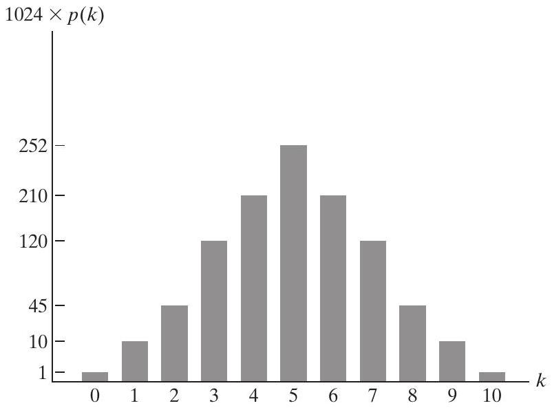 그림 4.6 $p(k)=\binom{10}{k}\left(\frac{1}{2}\right)^{10}$의 그래프. 따라서 $P\{X=k\} \geq P\{X=k-1\}$는 다음의 경우에만 성립한다.(n-k+1) p \geq k(1-p)