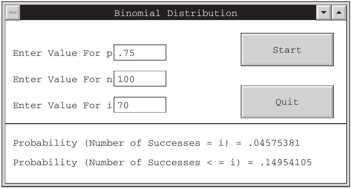 재귀 (6.3)을 활용하여 이항 분포 함수를 계산하는 컴퓨터 프로그램은 쉽게 작성할 수 있다. $P\{X \leq i\}$를 계산하기 위해 프로그램은 먼저 $P\{X=i\}$를 계산한 다음, 재귀를 사용하여 $P\{X= i-1\}, P\{X=i-2\}$ 등을 순차적으로 계산해야 한다. ## Historical note 성공 확률 $p$를 공통으로 갖는 독립 시행은 스위스 수학자 **자크 베르누이(Jacques Bernoulli, 1654-1705)**에 의해 처음 연구되었다. 그의 조카 니콜라스가 그가 사망한 지 8년 후인 1713년에 출판한 저서 **『추측술(Ars Conjectandi)』**에서 베르누이는 이러한 시행의 횟수가 많을 경우, 성공한 시행의 비율이 1에 가까운 확률로 $p$에 근접할 것이라는 것을 보여주었다. 자크 베르누이는 역사상 가장 유명한 수학자 가문의 1세대에 속한다. 총 8명에서 12명에 이르는 베르누이 가문 사람들은 3세대에 걸쳐 확률, 통계 및 수학에 근본적인 공헌을 했다. 정확한 수를 알기 어려운 한 가지 이유는 여러 명이 같은 이름을 가졌다는 사실 때문이다. (예를 들어, 자크의 형제 장(Jean)의 두 아들 중 한 명은 자크, 다른 한 명은 장이라는 이름을 가졌다.) 또 다른 어려움은 여러 베르누이 가문 사람들이 다른 장소에서 다른 이름으로 알려졌다는 점이다. 우리의 자크(때로는 Jaques로 표기)는 예를 들어 **야코프(Jakob, 때로는 Jacob으로 표기)**와 **제임스 베르누이(James Bernoulli)**로도 알려졌다. 그러나 그들의 수가 얼마였든 간에, 그들의 영향력과 업적은 엄청났다. 음악계의 바흐 가문처럼, 수학계의 베르누이 가문은 시대를 초월한 가문이었다! ## Example 6i $X$가 매개변수 $n=100$, $p=.75$를 갖는 이항 확률 변수일 때, $P\{X=70\}$과 $P\{X \leq 70\}$을 구하시오. 풀이 이항 계산기를 사용하여 다음 해를 얻을 수 있다:  그림 4.7