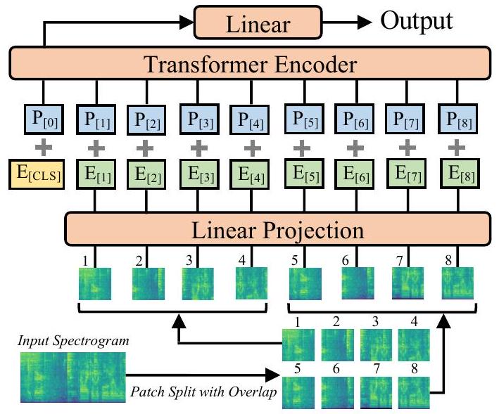 - [CLS] 토큰의 Transformer 인코더 출력은 오디오 스펙트로그램 표현으로 사용되며, 최종 선형 레이어를 통해 분류됩니다.
