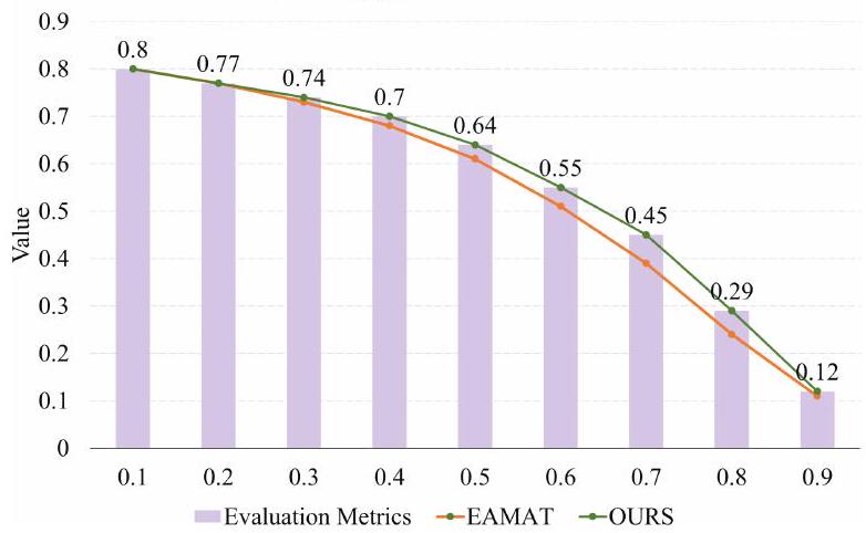 우리는 또한 더 미세한 단계에서 다양한 IoU 임계값에 대한 를 비교한다. Fig. 6은 에 대한 모델의 평가 결과를 보여준다. 우리 모델이 더 넓은 범위의 IoU 임계값에서 높은 성능을 제공함을 알 수 있다. 우리는 또한 이를 EAMAT [35]와 비교했으며, 우리 방법은 IoU 임계값이 증가함에 따라 더 높은 성능으로 개선된다.