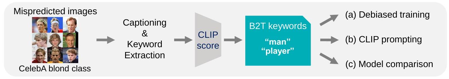 기여 (Contribution). 우리는 시각적 편향을 키워드로 식별하는 Bias-to-Text (B2T) 프레임워크를 소개한다. 이를 위해 먼저 잘못 예측된 이미지로부터 언어 설명을 생성하고, 이러한 설명에서 잠재적 편향을 시사하는 공통 키워드를 추출한다. 그런 다음 CLIP [59]과 같은 vision-language scoring model을 사용하여 잘못 예측된 이미지와의 유사도를 측정함으로써 이러한 키워드가 편향을 나타내는지 검증한다. 키워드가 올바른 이미지보다 오분류된 이미지와 더 밀접하게 일치하는지 확인함으로써, 우리는 그것이 편향임을 확인할 수 있다.