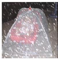 | Pred. | poncho | caldron | oil filter | wheelbarrow | bee | swing | baby pacifier | arched ceiling |