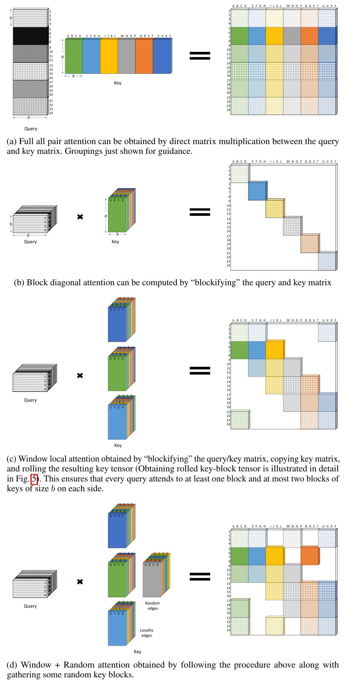 - BigBird-ETC: **Extended Transformer Construction (ETC)**에서는 CLS와 같은 추가적인 "global" 토큰을 포함한다. 구체적으로, 우리는 기존의 모든 토큰에 attend하는 개의 global token을 추가한다. 우리의 표기법으로는, 이는 행렬 에 개의 행을 추가하여 새로운 행렬 를 생성하는 것에 해당한다. 이때 모든 에 대해 및 이 되고, 모든 에 대해 가 된다. 이는 문맥을 저장할 추가적인 위치를 제공하며, 실험에서 보듯이 성능을 향상시킨다.