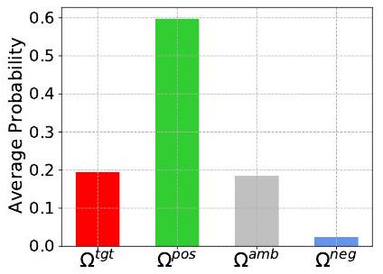 Fig. 5: Ground truth label이 다른 label subspace, 즉 target class , positive classes , ambiguous classes , negative classes 에 위치할 평균 확률. 이 실험은 90% 레이블되지 않은 THUMOS14에서 수행되었다.