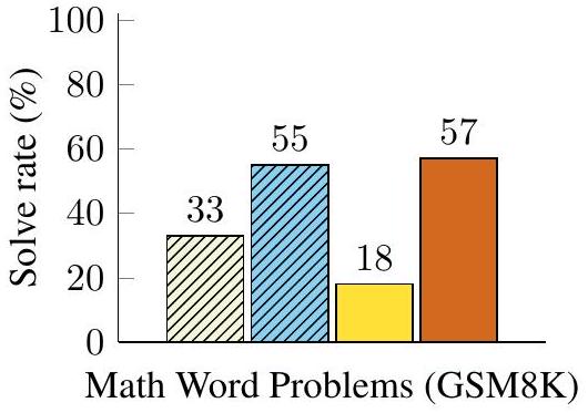 - State-of-the-Art 달성: PaLM 540B 모델에 단 8개의 CoT 예시를 제공하는 것만으로 GSM8K 수학 단어 문제 벤치마크에서 기존 fine-tuned GPT-3 모델을 능가하는 새로운 SOTA 정확도를 달성했습니다.