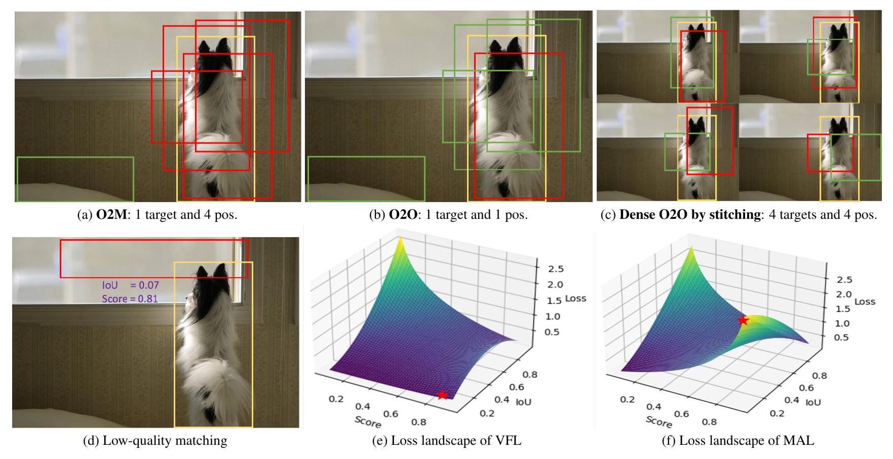 Figure 2. An illustration of our proposed DEIM. Yellow, red, and green boxes represent the GT, positive and negative samples, respectively. 'pos.' denotes the positive samples. Top: Our Dense O2O (Fig. 2c) can provide the same quality of positive samples as O2M (Fig. 2a). Bottom: For the low-quality matching, its loss values when using VFL [40] and MAL are marked by , indicating MAL can optimize those cases more effectively.