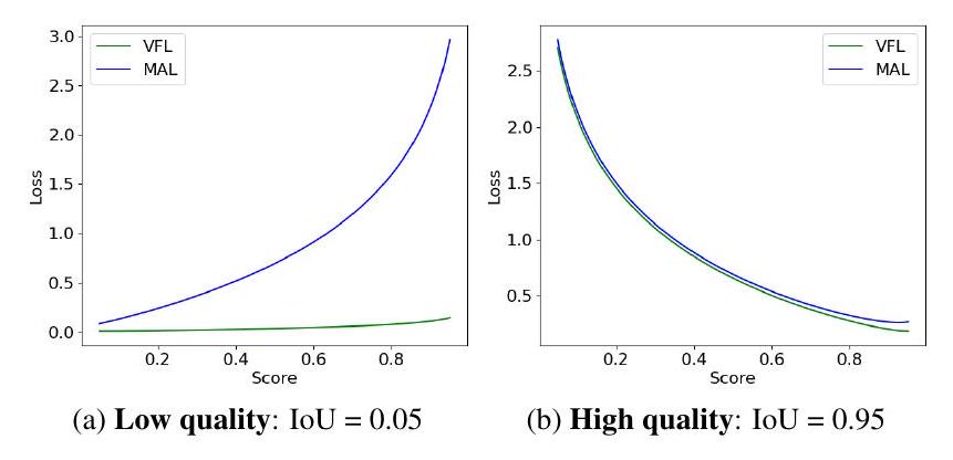 VFL과의 비교. 우리는 MAL과 VFL을 저품질 및 고품질 매치 모두를 처리하는 데 있어서 비교합니다. 저품질 매치의 경우(IoU=0.05, 그림 4a), MAL은 예측 신뢰도가 증가함에 따라 손실이 더 급격하게 증가하는 것을 보여주며, 이는 거의 변하지 않는 VFL과 대조됩니다. 고품질 매치의 경우(IoU=0.95, 그림 4b), MAL과 VFL 모두 유사하게 수행되어, MAL이 고품질 매치에 대한 성능을 저하시키지 않으면서 학습 효율성을 향상시킨다는 것을 확인시켜 줍니다.