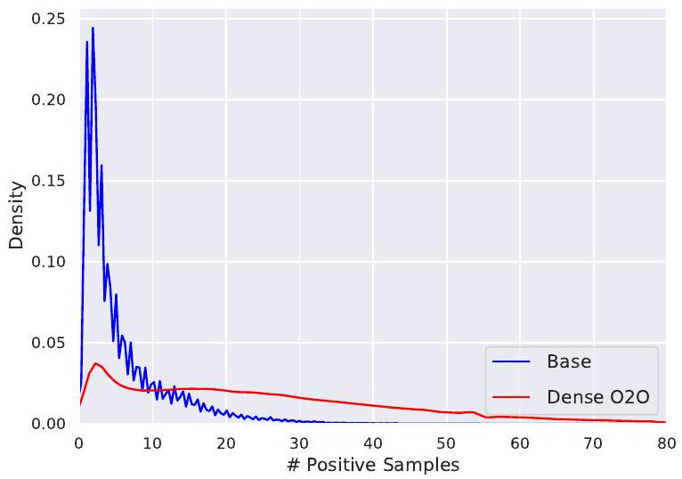 Dense O2O 사용 여부에 따른 포지티브 샘플 수. 한 에포크의 학습 동안, 우리는 동일한 학습 이미지에서 포지티브 샘플 수를 비교했습니다.