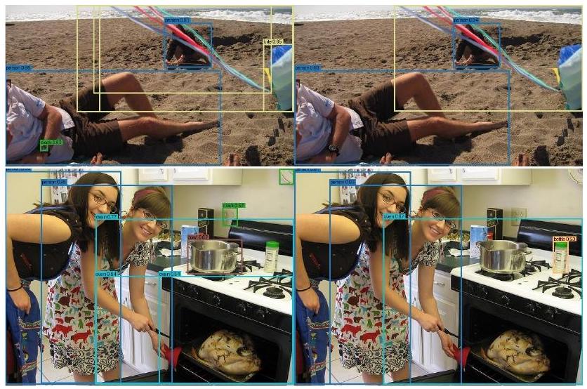 Figure 7. Qualitative Comparison between D-FINE-L and DEIM. In each paired image, the left is from D-FINE-L while the right is predicted by DEIM-D-FINE-L (Score threshold ).