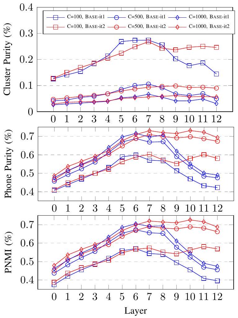 cluster purity, phone purity, and phone normalized mutual information (PNMI)로 측정된 교사 품질은 그림 2에 나와 있습니다. 기준으로, MFCC는 에 대해 (cluster purity, phone purity, PNMI) = (0.099, 0.335, 0.255)를, 에 대해 (0.031, 0.356, 0.287)를 달성합니다.