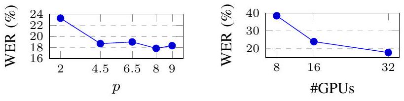 Fig. 3: 마스킹 확률 p(왼쪽)와 GPU 수를 통한 유효 배치 크기(오른쪽) 변경.