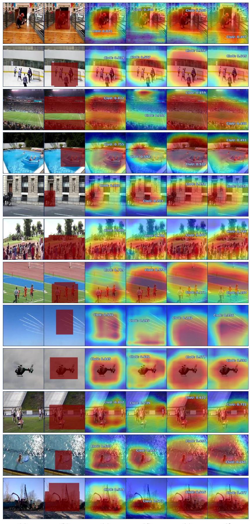 Figure 11. VGG-SS [5]에서 의 영향을 보여주는 추가적인 정성적 결과. (a) 입력 이미지. (b) Ground-Truth. (c) cross-modal attention matching이 없는 크기의 attention map. (d) cross-modal attention matching이 없는 크기의 attention map. (e) cross-modal attention matching이 있는 크기의 attention map. (f) cross-modal attention matching이 있는 크기의 attention map.