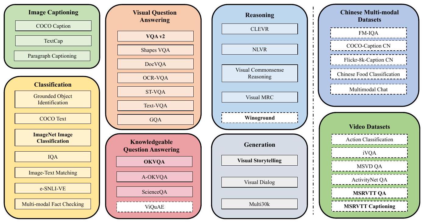 - Task 커버리지: 이미지 캡셔닝, VQA, 지식 기반 VQA (KVQA), 추론, 분류, 생성, 중국어 Vision-Language task, 비디오-언어 task 등 광범위한 멀티모달 task를 포괄합니다.