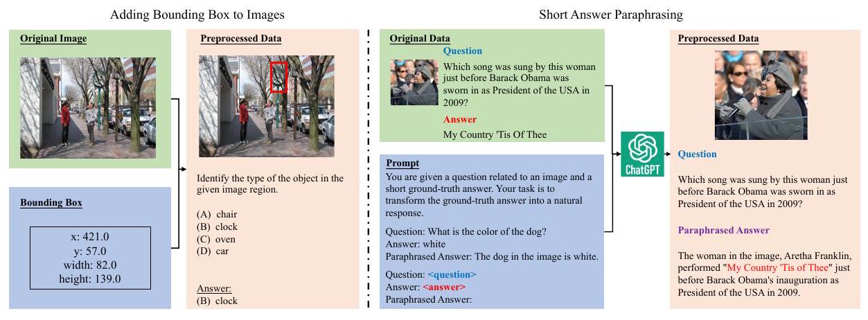 - 데이터 형식 통합: 이미지와 텍스트를 통합된 스키마로 처리. 특히, 바운딩 박스는 이미지에 직접 빨간색 사각형으로 태그하여 시각적 힌트를 제공하고, 짧은 답변은 ChatGPT를 활용하여 추가 맥락 정보를 포함한 자연스러운 응답으로 의역했습니다.