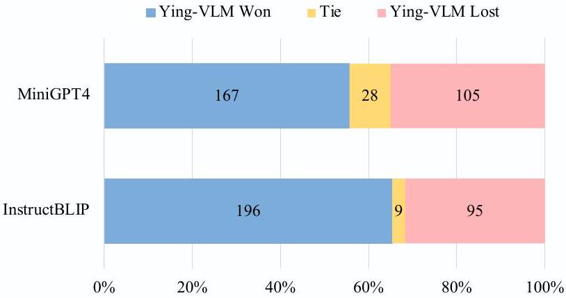 - GPT-4 평가 결과: GPT-4를 평가자로 활용한 결과, Ying-VLM은 가장 강력한 baseline인 MiniGPT4에 비해 55.6%의 승률을, InstructBLIP에 비해 65.5%의 승률을 기록하며 더 정확하고 매력적인 응답을 생성함을 입증했습니다.
