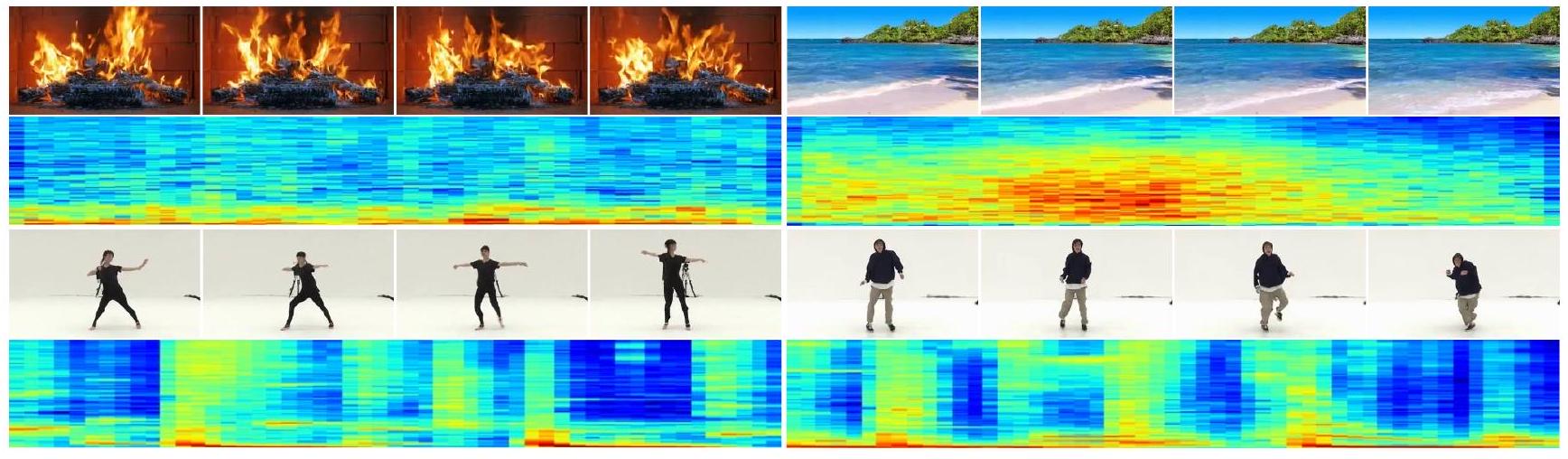 그림 1. Landscape [22] 및 AIST++ 데이터셋 [23]에서 생성된 비디오 프레임(256x256) 및 오디오 스펙트로그램의 예시. 생생한 모닥불이 타오르는 모습, 아름다운 파도가 움직이는 모습, 우아한 춤을 볼 수 있습니다. 비디오의 외형과 일치하는 오디오가 생성됩니다(예: 댄서의 주기적인 리듬). 완전한 고충실도 비디오 및 오디오는 보충 자료에서 확인할 수 있습니다.