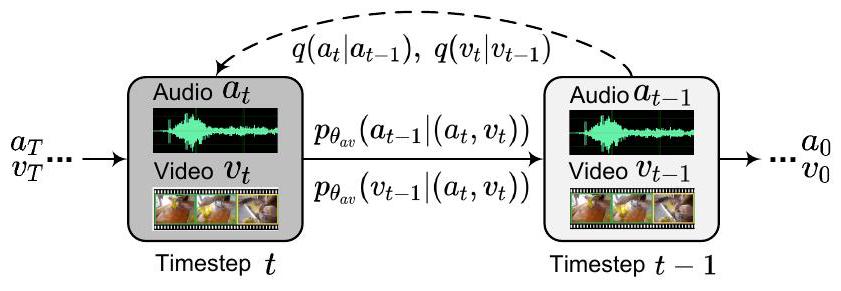 1D 오디오 세트 와 3D 비디오 세트 에서 쌍을 이룬 데이터 ()가 주어졌을 때, 각 모달리티의 순방향 프로세스는 서로 다른 분포에 있기 때문에 독립적이라고 간주합니다. 오디오 를 예로 들면, 시간 단계 에서의 순방향 프로세스는 다음과 같이 정의됩니다:
