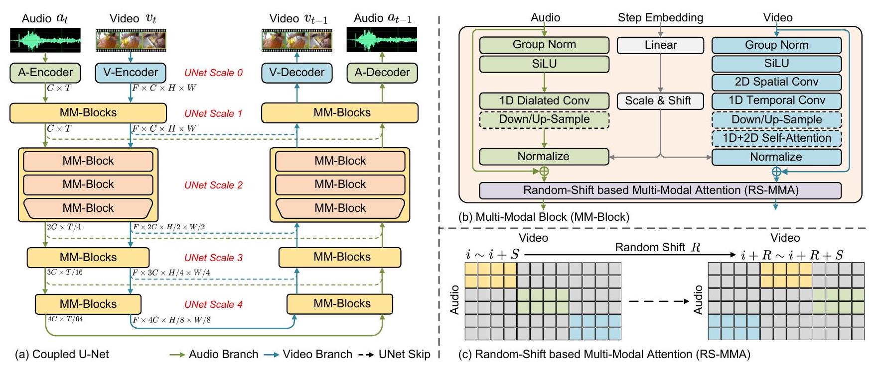 - Random-Shift 기반 Multi-Modal Attention (RS-MMA): 비디오와 오디오 간의 의미론적 일관성을 보장하기 위해 제안된 메커니즘입니다. 오디오 스트림을 비디오 프레임의 시간 단계에 따라 세그먼트로 분할하고, 랜덤 시프트(Random-shift)를 적용하여 이웃 기간 내에서 오디오 세그먼트와 비디오 세그먼트 간의 교차 어텐션을 수행합니다. 이는 계산 복잡도를 줄이면서도 전역 어텐션 기능을 유지하여 효율적인 교차 모달 상호작용을 촉진합니다.