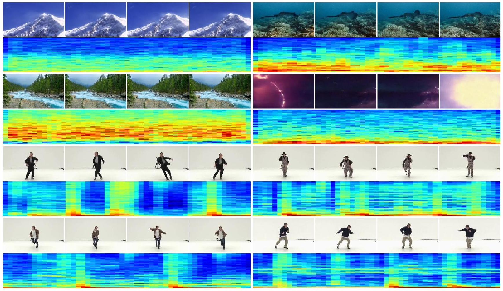 그림 4. 의미적으로 일관된 오디오(스펙트로그램으로 표시됨)와 함께 생성된 비디오 프레임()의 더 많은 시각적 예. 일부 사례는 눈 덮인 산에서 바람이 부는 모습을 생생하게 보여주고, 일부는 아름다운 장면과 함께 지속적인 강물 소리를 보여줍니다. Landscape 및 AIST++에 대한 결과는 표 1과 표 2에 나와 있습니다.