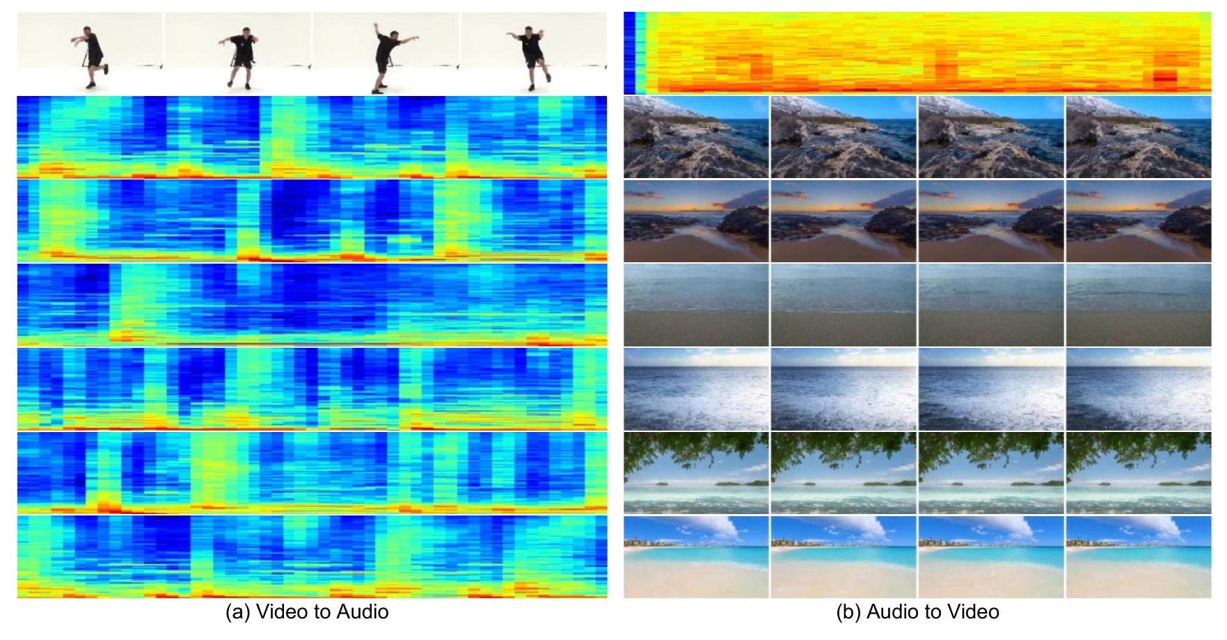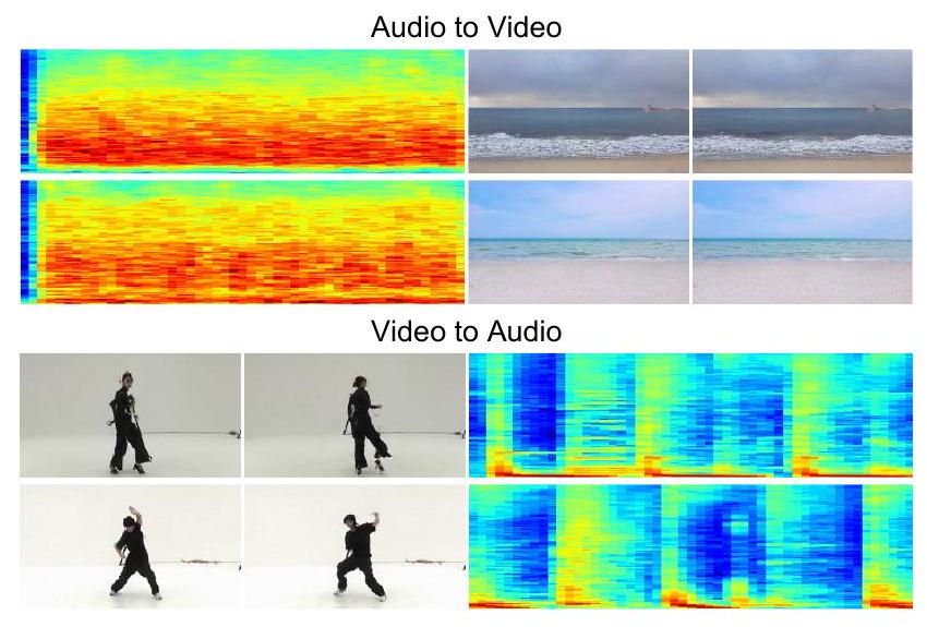 구배 유도 방법이 대체 방법보다 주어진 오디오와 의미적, 시간적으로 정렬된 일관된 비디오를 얻는 데 더 좋습니다. 결과는 또한 우리 모델이 추가적인 훈련 없이도 모달리티 전송 능력을 가지고 있음을 보여줍니다. 그림 5는 우리 모델이 유사한 패턴을 가진 오디오에서 유사한 장면(바다)의 비디오를 생성하거나, 입력 댄스 비디오의 리듬에 맞는 오디오를 생성할 수 있음을 보여줍니다. 이는 우리의 공동 학습이 단일 모달리티 생성을 향상시킬 수 있음을 더욱 검증합니다.