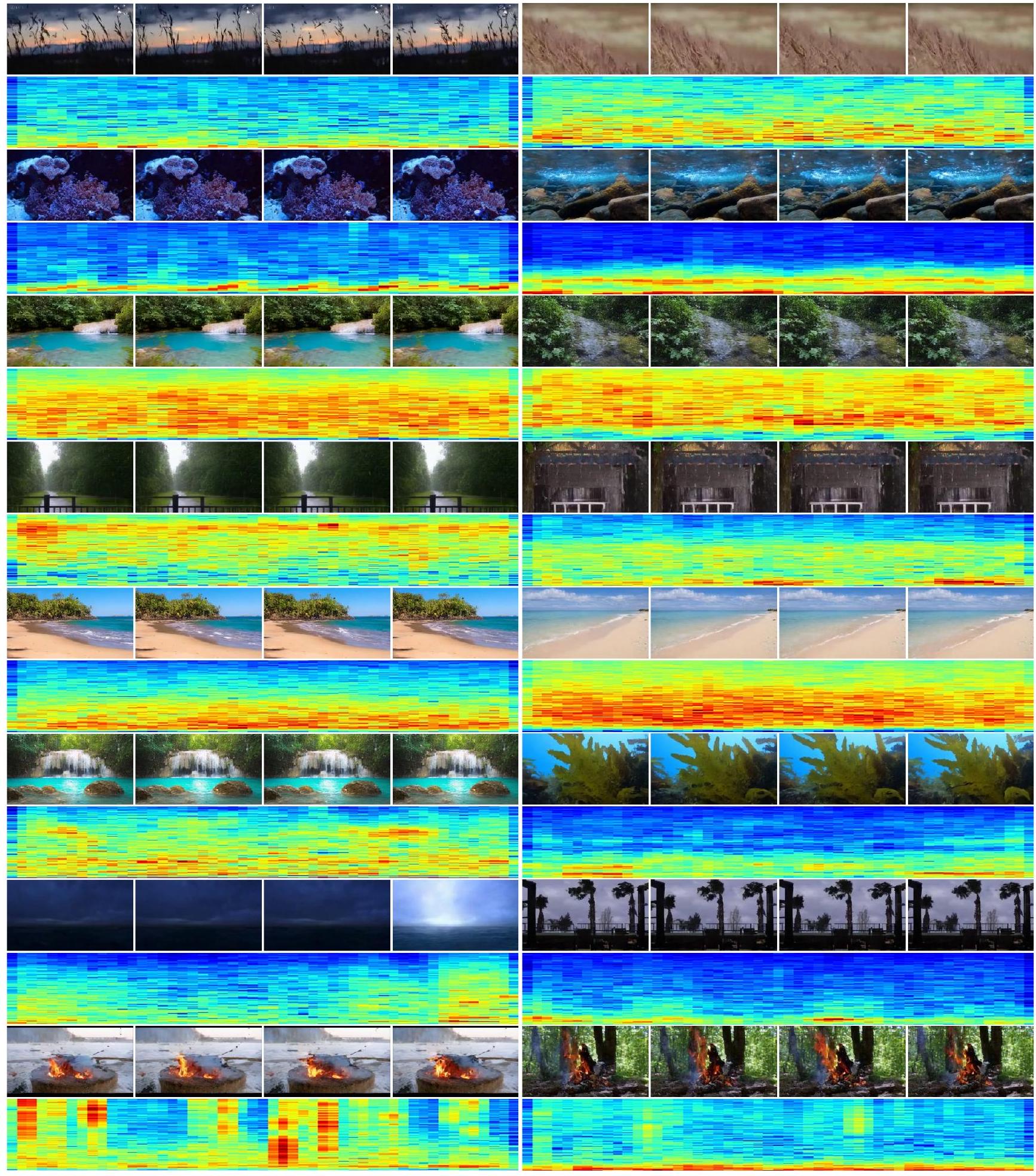 그림 C.1. 우리 MM-Diffusion의 Landscape에서 더 많은 생성 결과. 주어진 사례는 각각 바람이 부는 장면, 수중, 물 튀김, 비, 물 철벅거림, 폭포, 천둥, 불꽃놀이 장면을 보여줍니다.