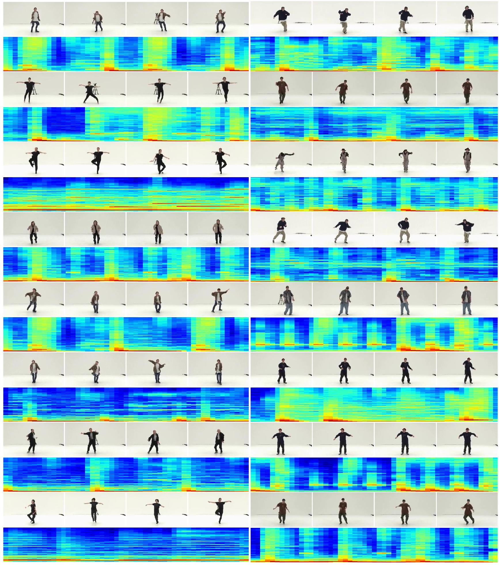 그림 C.2. 우리 MM-Diffusion의 AIST++에서 더 많은 생성 결과. 비디오 외형과 일치하는 오디오가 생성됩니다(예: 댄서의 주기적인 리듬).