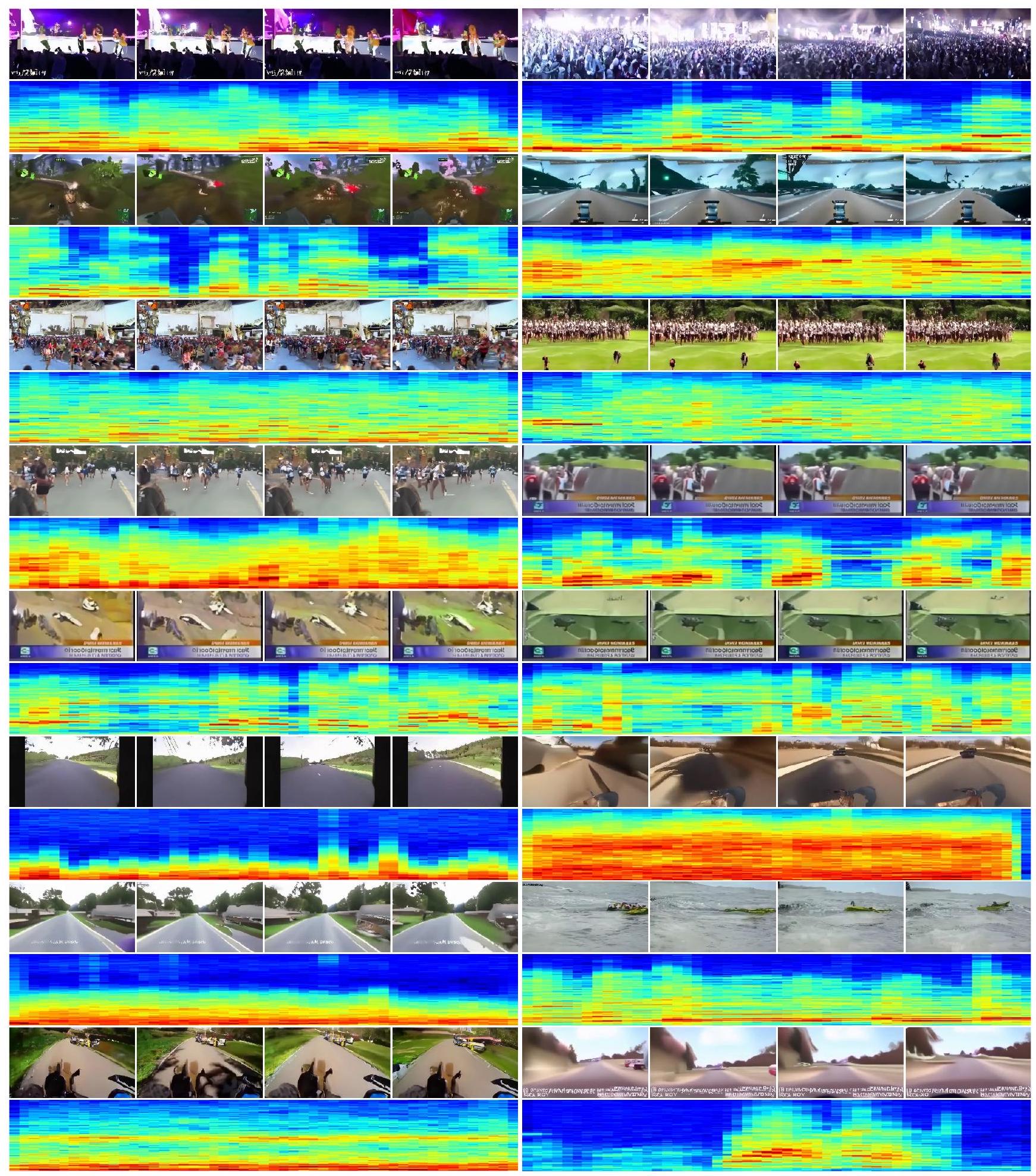 그림 C.3. 우리 MM-Diffusion의 오픈 도메인(AudioSet)에서 더 많은 생성 결과. 주어진 사례는 각각 콘서트, 게임 스트리밍, 마라톤, 뉴스 재생, 서핑 및 1인칭 시점 운전 장면을 보여줍니다.