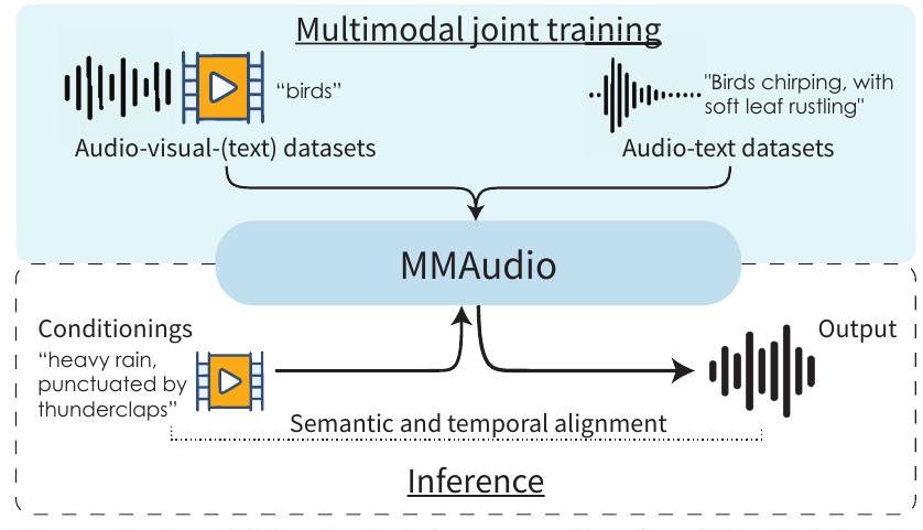 Figure 1. 오디오-비주얼-(텍스트) 데이터셋 학습 외에도, 우리는 효과적인 데이터 확장을 가능하게 하는 고품질의 풍부한 오디오-텍스트 데이터로 multimodal joint training을 수행합니다. 추론 시, MMAudio는 비디오 및/또는 텍스트 안내를 통해 조건에 정렬된 오디오를 생성합니다.