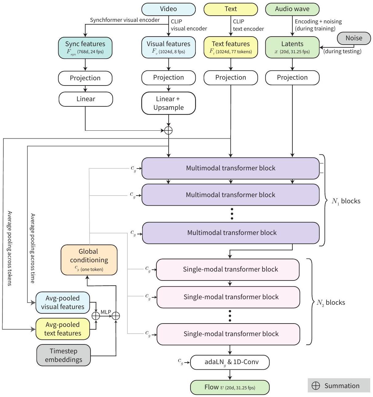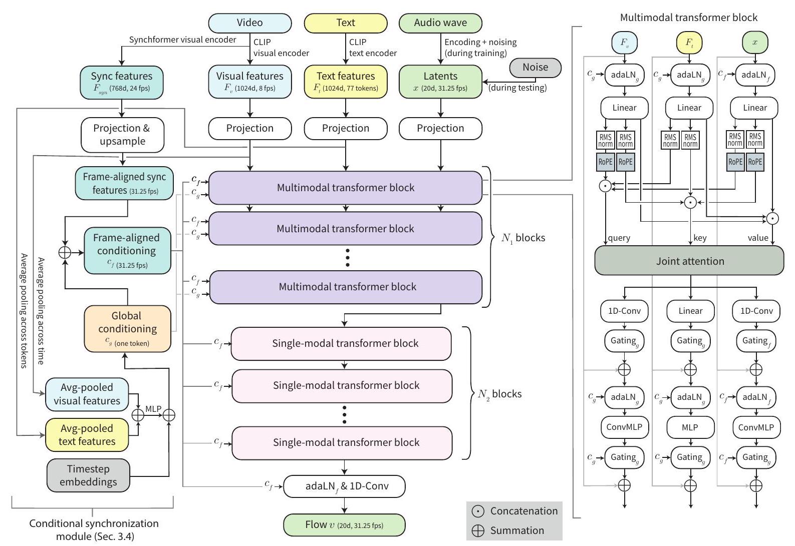 - MMAudio 프레임워크: 단일 멀티모달 트랜스포머 네트워크에서 비디오, 오디오, 텍스트를 함께 고려하며, 학습 중 누락된 모달리티를 마스킹하는 패러다임을 사용한다. Conditional Flow Matching 목표로 학습된다.