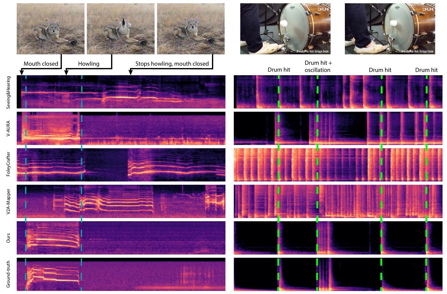 - 합성된 오디오는 1) 의미적으로 비디오에 정렬되고, 2) 시간적으로 동기화되어야 한다. 인간은 25ms의 미세한 오디오-비주얼 불일치도 인지할 수 있어 정밀한 동기화가 필수적이다.