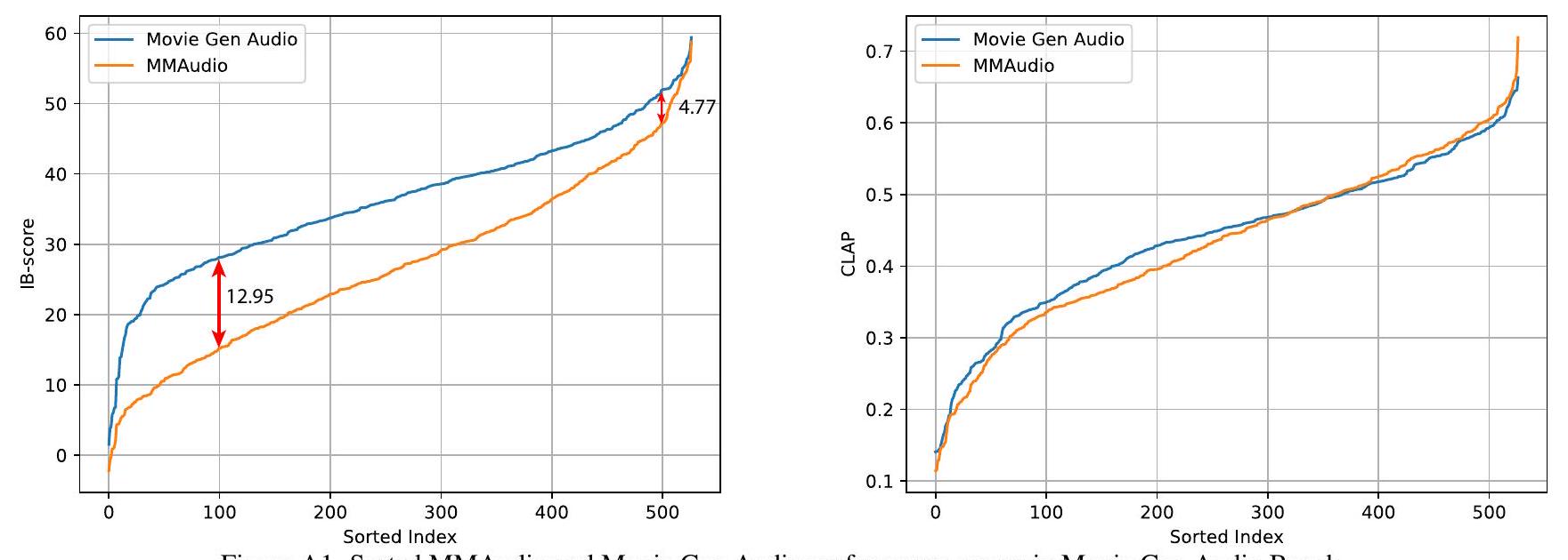 또한, IB-점수 측면에서, 우리는 MMAudio가 일부 비디오에서 더 어려움을 겪는 반면, Movie Gen Audio는 더 일관된 결과를 제공한다는 것을 발견했습니다. 우리는 그림 A1(왼쪽)에서 MMAudio와 Movie Gen Audio를 비교하는 정렬된 IB-점수를 그립니다. Movie Gen Audio는 저성능 영역에서 일관되게 더 나은 성능을 보이지만, 고성능 영역에서는 격차가 좁혀집니다. 이는 우리의 제한된 훈련 데이터가 Movie Gen Audio Bench의 데이터를 적절히 포함하지 못하여 익숙하지 않은 비디오 유형에서 부족하기 때문이라고 생각합니다. 참고로, 우리의 유일한 비디오-오디오 훈련 데이터셋은 310개 클래스의 비디오를 포함하는 VGGSound [1]입니다. 우리는 이 클래스를 넘어서는 공개 데이터를 수집하는 것이 이 성능 격차를 효과적으로 줄일 수 있다고 가정합니다. CLAP 점수의 경우 훨씬 작은 규모로 동일한 현상이 발생하는데, 이는 우리가 더 많은 오디오-텍스트 데이터를 사용하기 때문일 수 있습니다. 그림 A2는 훈련 데이터에 의해 잘/잘 다루어지지 않는 개념을 가진 비디오에서 우리가 상당히 높거나 낮은 IB-점수를 얻는 예시를 보여줍니다.