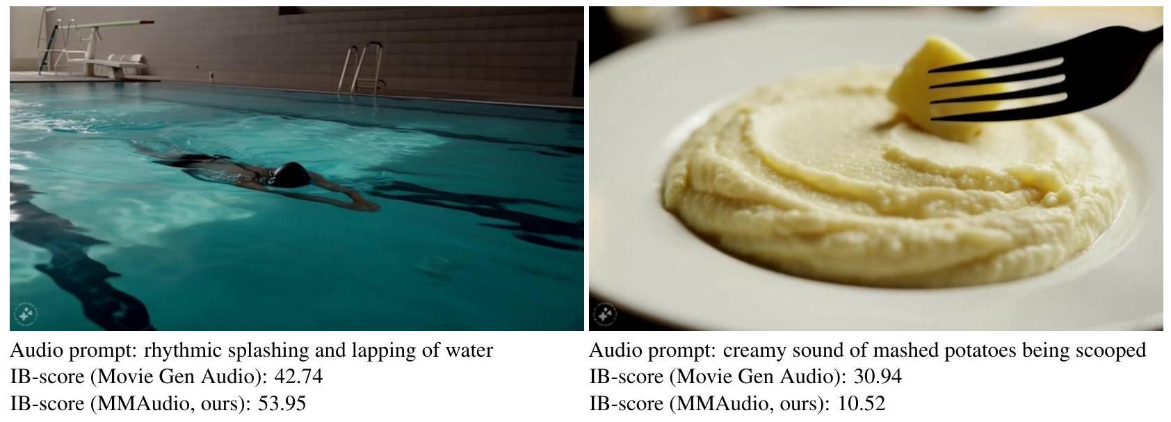 그림 A2. 훈련 데이터에 의해 잘/잘 다루어지지 않는 Movie Gen Audio Bench의 비디오 예시. 왼쪽: 훈련 데이터에 익숙한 개념(VGGSound 훈련 세트에 516개의 수영 비디오)이 있는 경우, MMAudio는 더 높은 IB 점수를 달성합니다. 오른쪽: 익숙하지 않은 개념(제공된 레이블에 따르면 VGGSound [1]에는 으깬 감자에 대한 비디오가 없음)이 있는 경우, MMAudio는 상당히 낮은 IB 점수를 얻습니다.