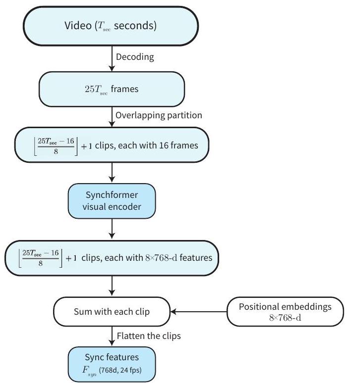 - 오디오-비주얼 동기화를 더욱 향상시키기 위해 Synchformer [19]의 시각 인코더를 사용하여 높은 프레임률(24fps)의 동기화 특징()을 추출한다.