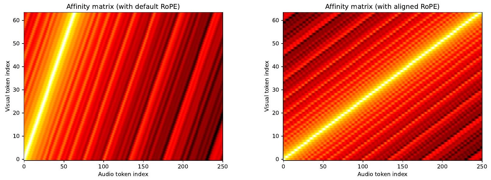 - Aligned RoPE positional embeddings: 시각(8fps) 및 오디오(31.25fps) 스트림의 서로 다른 프레임 속도를 정렬하기 위해 시각 스트림의 위치 임베딩 주파수를 비례적으로 스케일링한다.