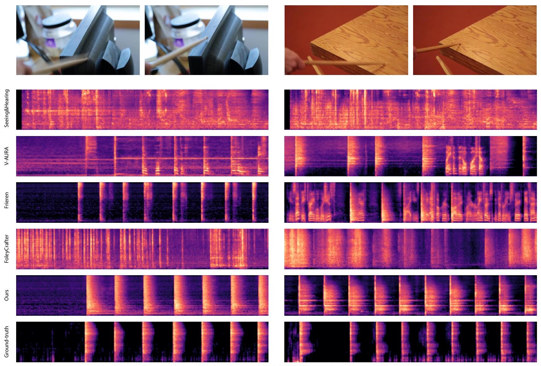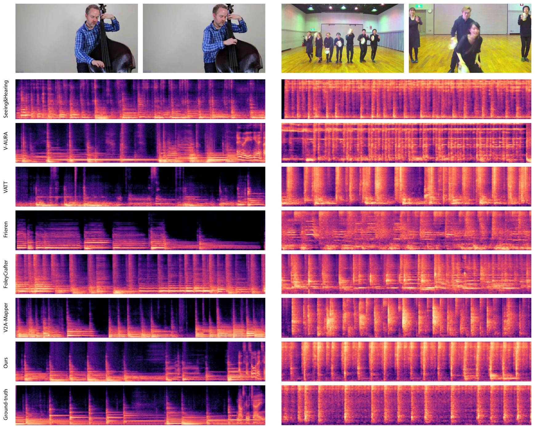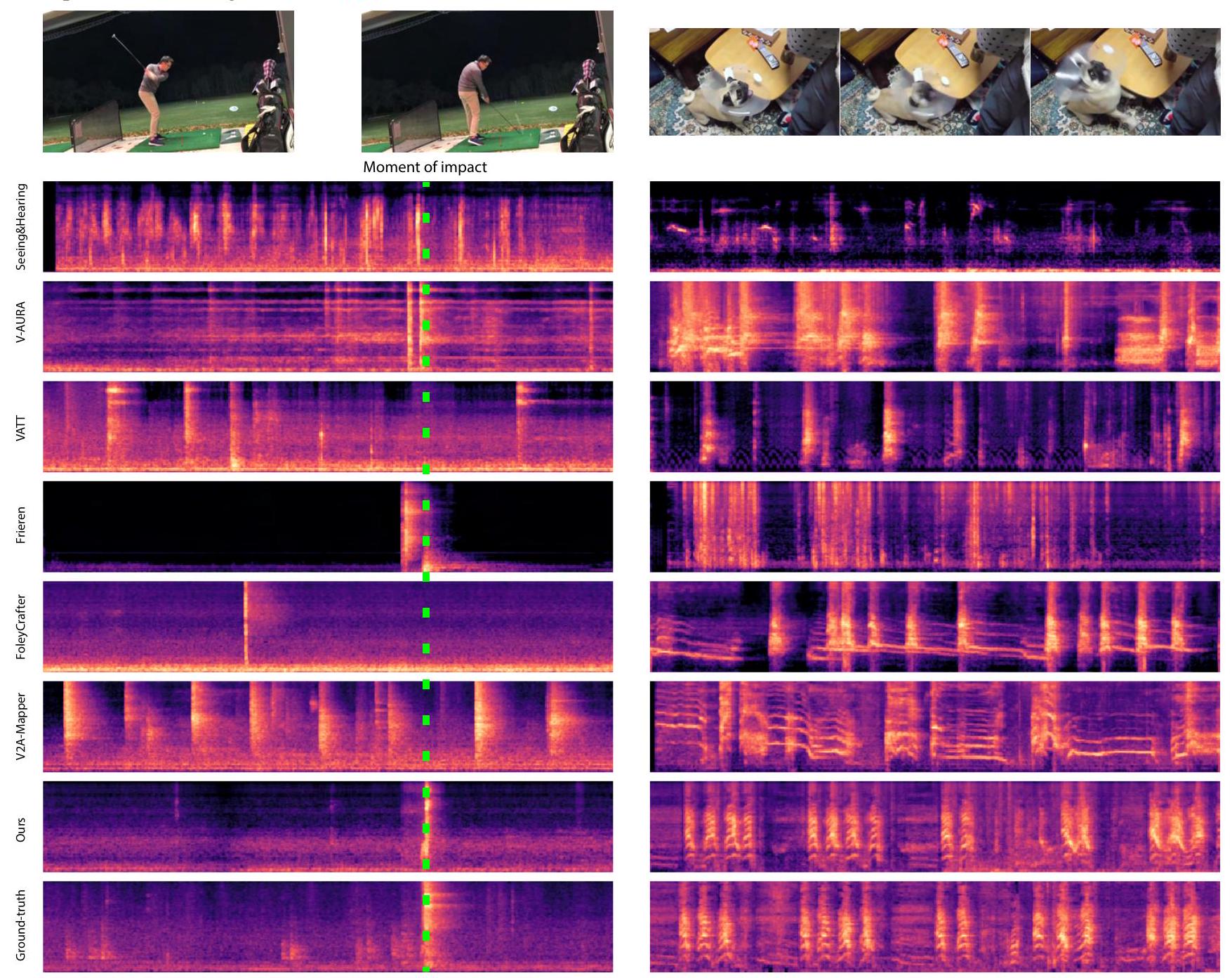 - 주어진 비디오에 대해 주변 소리(예: 비, 강물) 및 시각적 사건으로 인한 음향 효과(예: 개 짖는 소리, 테니스공 치는 소리)를 합성하는 Foley 작업에 초점을 맞춘다.