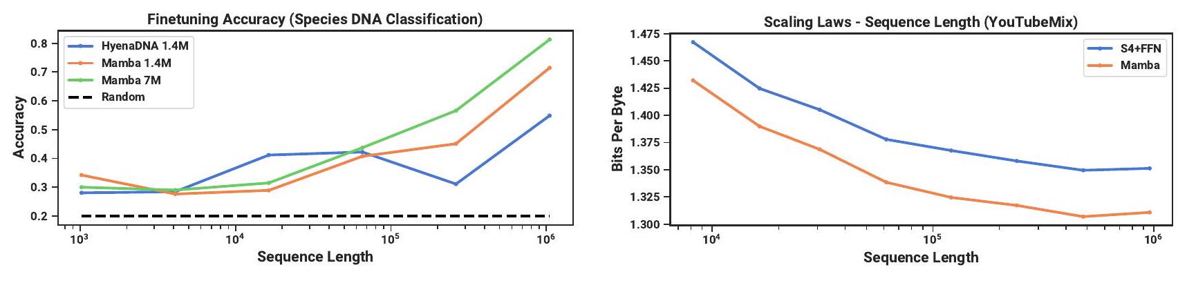 - DNA 모델링: Mamba는 HG38 데이터셋 사전학습에서 HyenaDNA 및 Transformer++보다 적은 파라미터로 더 잘 스케일링되었다. 또한, 1M에 달하는 극도로 긴 시퀀스에서도 긴 컨텍스트를 활용하여 사전학습 perplexity가 향상되었으며, 이는 컨텍스트 길이가 길어질수록 성능이 저하되는 HyenaDNA와 대조된다. 5가지 유인원 종 분류 다운스트림 태스크에서 Mamba는 7M 파라미터 모델로 81.31%의 높은 정확도를 달성했다.