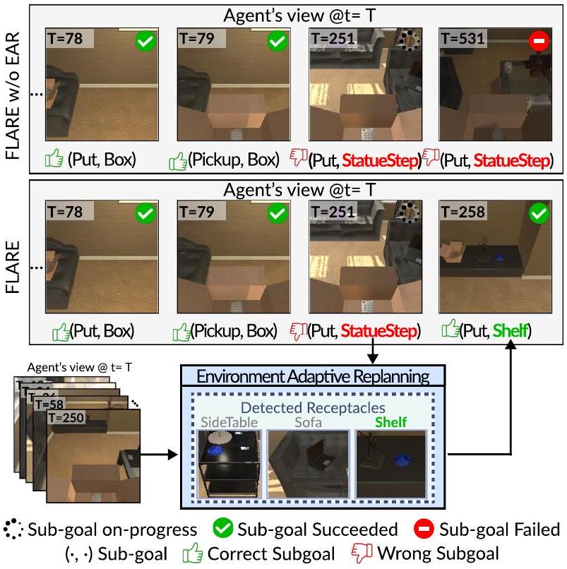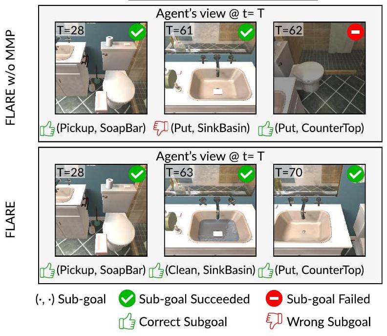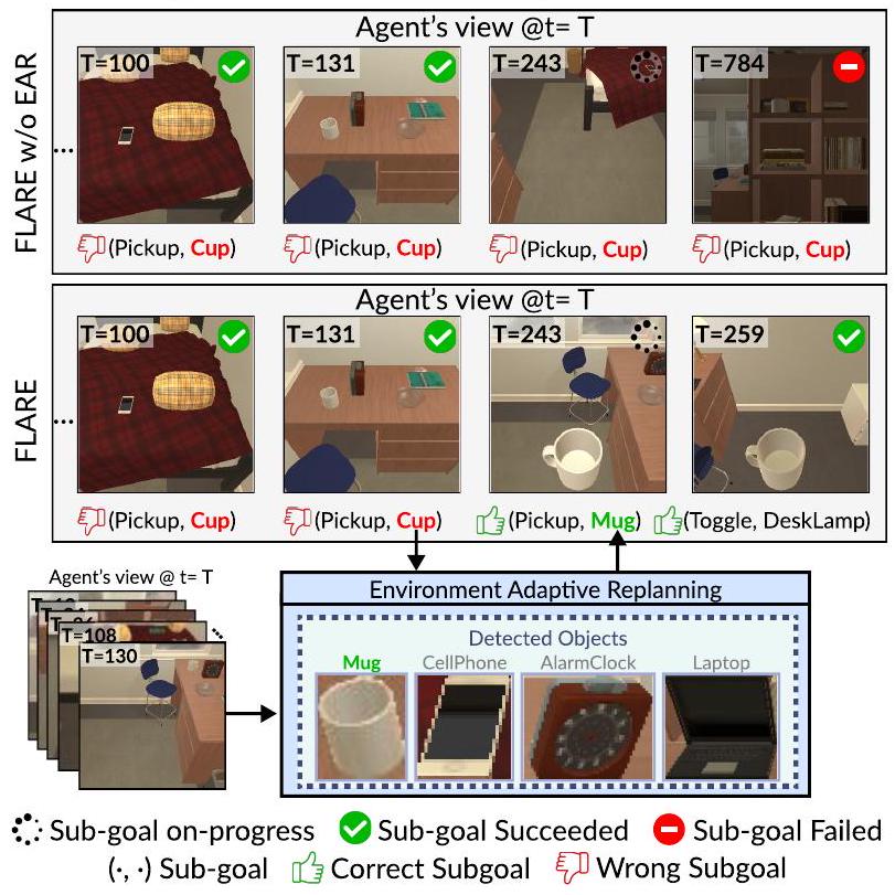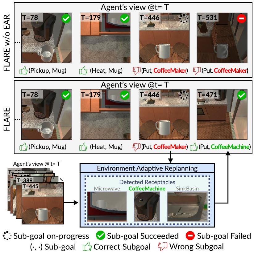 이와 대조적으로, EAR을 갖춘 에이전트(즉, FLARE)는 지시된 Cup이 오해의 소지가 있음을 인지하고, 장면에 제시된 Mug로 대체한다. 그에 따라 계획을 조정한 후, 에이전트는 나머지 subgoal을 수행하고 궁극적으로 task를 완료한다.
