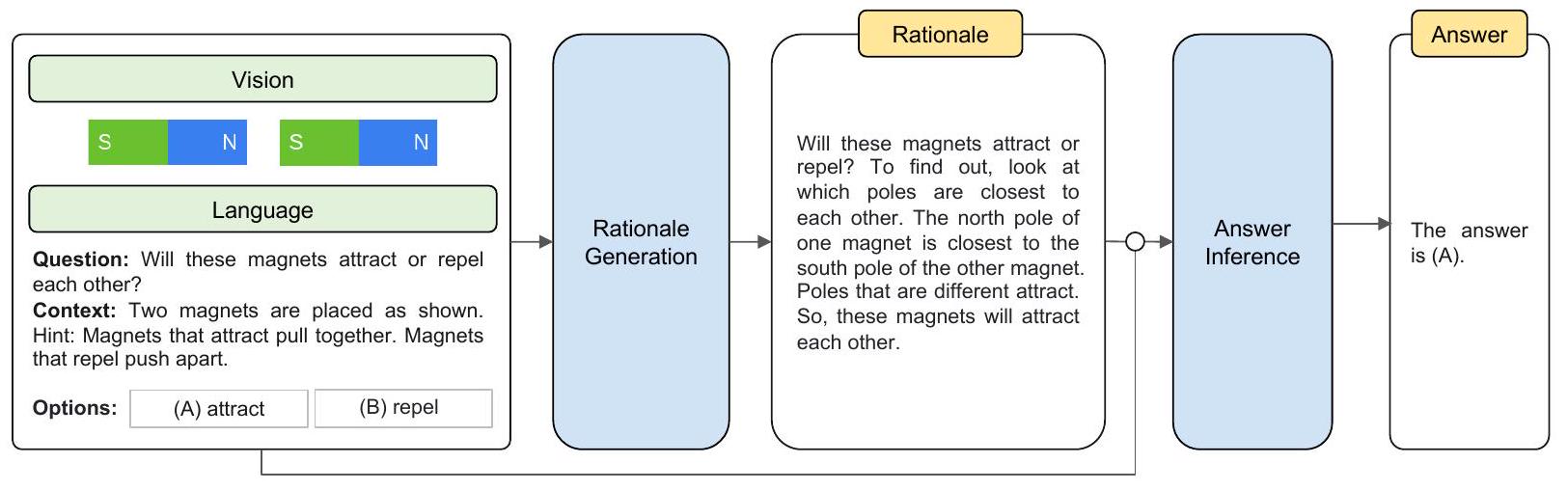 Multimodal-CoT는 **추론 과정 생성(Rationale Generation)**과 **답변 추론(Answer Inference)**의 두 단계로 구성된 프레임워크이다.