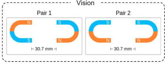 Question: 각 쌍의 자석들 사이에 작용하는 자기력에 대해 생각해 보십시오. 다음 진술 중 어느 것이 사실입니까? Context: 아래 이미지는 두 쌍의 자석을 보여줍니다. 다른 쌍의 자석들은 서로 영향을 주지 않습니다. 표시된 모든 자석은 동일한 재료로 만들어졌습니다.