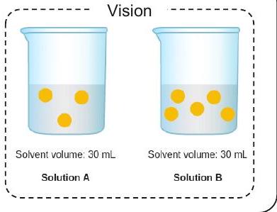 Gold Rationale: 용액 A와 용액 B에서 노란색 입자는 용질을 나타낸다. 어떤 용액이 노란색 입자의 농도가 더 높은지 파악하려면, 각 용기 내의 노란색 입자 수와 용매의 부피를 모두 살펴봐야 한다. 농도 공식을 사용하여 밀리리터당 노란색 입자 수를 구한다. 용액 B는 밀리리터당 노란색 입자 수가 더 많다. 따라서 용액 B가 노란색 입자의 농도가 더 높다.