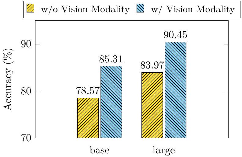 Section 3에서 우리는 시각 feature의 포함이 더 효과적인 rationale 생성에 긍정적인 영향을 미치며, 결과적으로 답변 정확도를 향상시킨다는 것을 관찰했다. 시각 feature를 통합하는 것 외에도, 잘못된 rationale 문제를 해결하는 또 다른 접근 방식은 language model (LM)의 크기를 확장하는 것이다. Figure 8은 시각 feature 통합 여부에 따른 우리의 2단계 학습 프레임워크의 답변 정확도를 보여준다. 특히, 더 큰 LM을 사용할 때, baseline 정확도(시각 feature 없음)가 크게 향상되는 것을 확인할 수 있다. 이러한 결과는 LM 크기를 확장하는 것이 잘못된 rationale 문제를 완화할 수 있음을 시사한다. 그러나 성능이 여전히 시각 feature를 활용하는 경우에 비해 상당히 부족하다는 점을 인지하는 것이 중요하다. 이 결과는 다양한 LM 크기에서도 우리의 Multimodal-CoT 방법론의 효과를 더욱 입증한다.