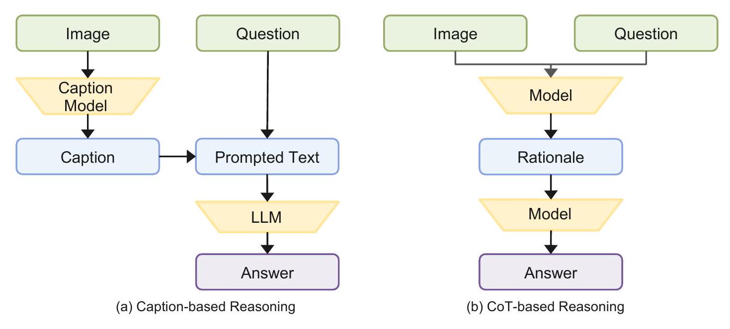 우리의 연구는 멀티모달 시나리오에서 CoT-based Reasoning 패러다임과 일치하며, 특히 <question + image rationale answer> 프레임워크를 사용한다 (Figure 9b). 이 접근 방식은 두 가지 측면에서 이점을 제공한다. 첫째, Multimodal-CoT 프레임워크는 vision 및 language 입력 간의 feature-level 상호 작용을 활용하여, 모델이 입력 정보를 더 깊이 이해하고 타당한 rationale를 통합하여 답변을 더 효과적으로 추론할 수 있도록 한다. 우리의 분석은 Multimodal-CoT가 hallucination을 완화하고 수렴을 향상시켜 벤치마크 데이터셋에서 우수한 성능을 달성함으로써 주목할 만한 이점을 제공함을 입증했다. 둘째, Multimodal-CoT의 경량 특성은 자원 제약과 호환되며 잠재적인 paywall을 우회한다.