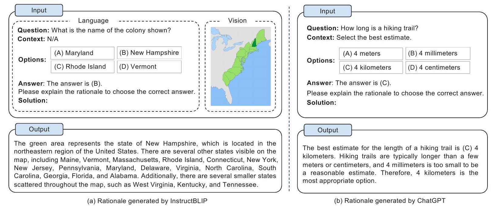 Multimodal-CoT의 1단계 학습 동안, 우리의 목표 rationales는 벤치마크 데이터셋의 **인간 주석(human annotation)**에 기반한다. 이제 우리는 목표 rationales를 LLM 또는 vision-language model이 생성한 것으로 대체한다. 구체적으로, 우리는 **이미지가 포함된 질문(IMG)**과 **이미지가 없는 질문(TXT)**을 각각 InstructBLIP (Dai et al., 2023) (Figure 10a)과 ChatGPT (Figure 10b)에 zero-shot inference 방식으로 입력한다. 그런 다음, 생성된 pseudo-rationales를 학습을 위한 목표 rationales로 사용하며, 추론 체인에 대한 인간 주석에 의존하지 않는다.