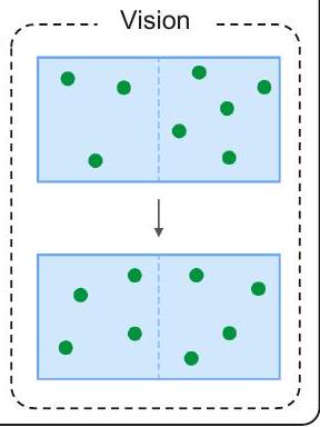 맥락: 아래 다이어그램은 하나의 용질을 포함하는 용액을 보여준다. 각 용질 입자는 녹색 공으로 표현된다. 용액은 막에 의해 절반으로 나뉜 밀폐된 용기에 채워져 있다. 점선으로 표현된 막은 용질 입자에 투과성이다. 이 다이어그램은 확산 과정 동안 용액이 시간이 지남에 따라 어떻게 변할 수 있는지를 보여준다.