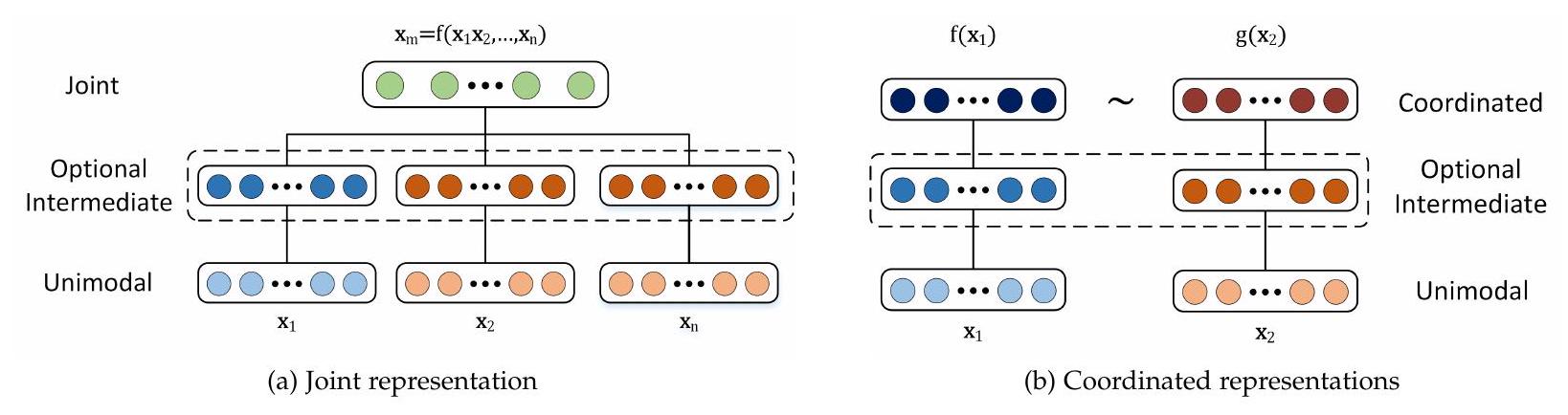 여기서 multimodal representation 은 unimodal representation 에 의존하는 함수 (예: deep neural network, restricted Boltzmann machine, 또는 recurrent neural network)를 사용하여 계산됩니다. 반면 coordinated representation은 다음과 같습니다: